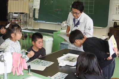 出前講座 投稿: ホームページ編集者 (10/30) 10月30日(木) 4年生が、市役所生活環境課の方を招き、水生生物による水質判定のやり方を学びました。地域を流れる川の環境を知り、地域の自然を大切にしていこうという思いを高めました。自ら考え行動する力を育んでいます。 -