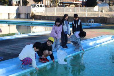 生活科 冬となかよし 投稿: ホームページ編集者 (01/23) 1月23日(金) 1年生の生活科「冬となかよし」では、気温の変化、季節ならではの遊びなど、冬の自然に目を向ける活動を行っています。今日は、プールに氷が張っていることに気付き、氷の様子を確かめに行きました。指で氷をつついて冷たさを確かめたり、棒で氷を叩いて厚さを確かめたりしました。観察し、自然の変化に気付く力が身に付いています。 -