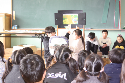 国語(4年) 投稿: ホームページ編集者 (03/17) 3月17日(火) 4年生が国語の教材にある人形劇「木竜うるし」を1・2年生に披露しました。登場人物の性格や気持ちの移り変わりを意識して表現することができました。 -