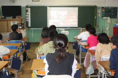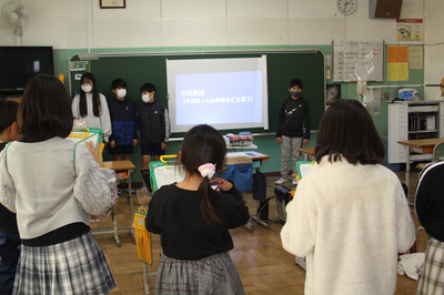 全校で「どうしたら、相手に伝わりやすいスライドが作れるか」について考えました。スライドは一目でわかるように作ることが大切であることに気付き、「これからは、短い言葉で表そう。」と発言していました。情報を選び活用する力が育成されています。