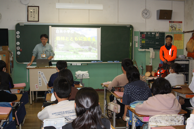 5年生が白糸タイム(総合学習)の授業の一環で、ホールアース自然学校と森風舎(きこり)の方を招き、林業について学びました。「森林とともに生きる」をテーマに話を聞き、質問をたくさんしました。根拠を明確にする力が養われています。