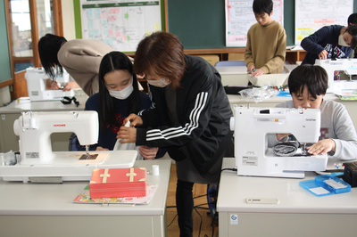 6年生が家庭科で使用目的にあった袋を作成しています。その際、地域の方の協力を得て学んでいます。物作りの楽しさや達成感を味わいながら、生活に生かす力を育てています。